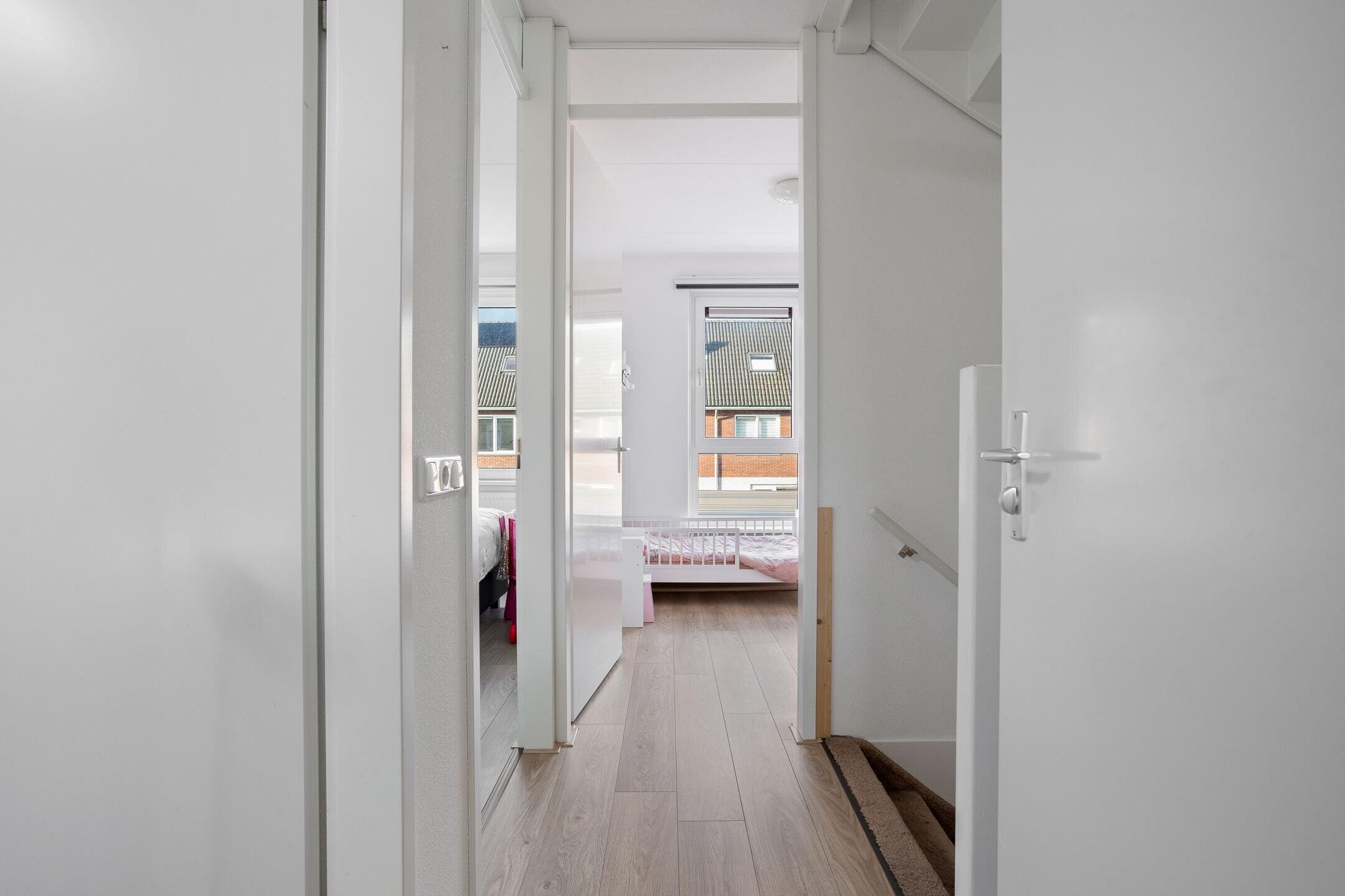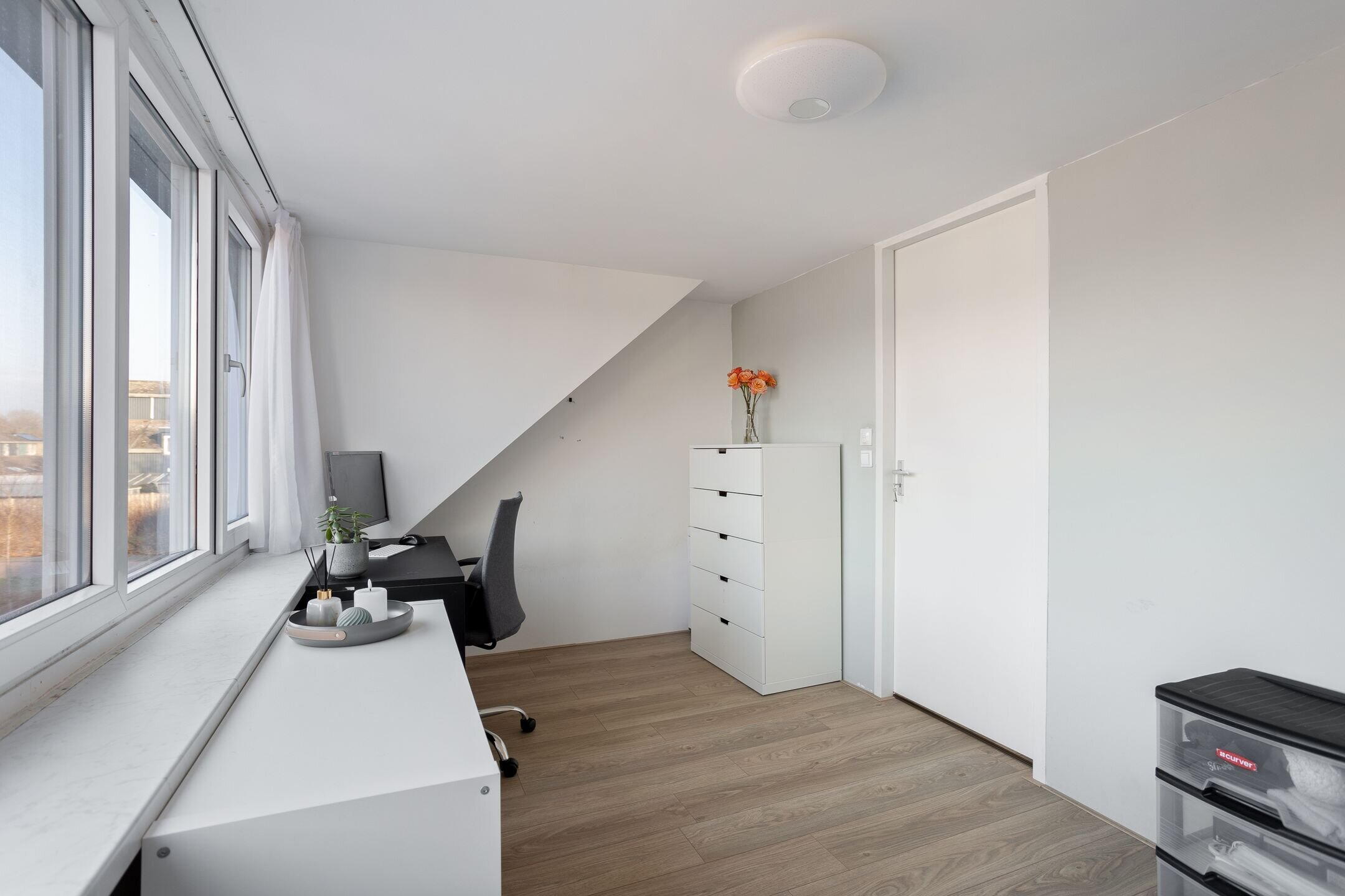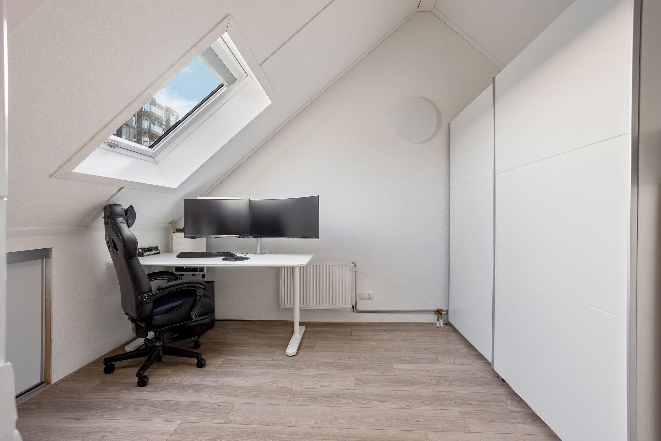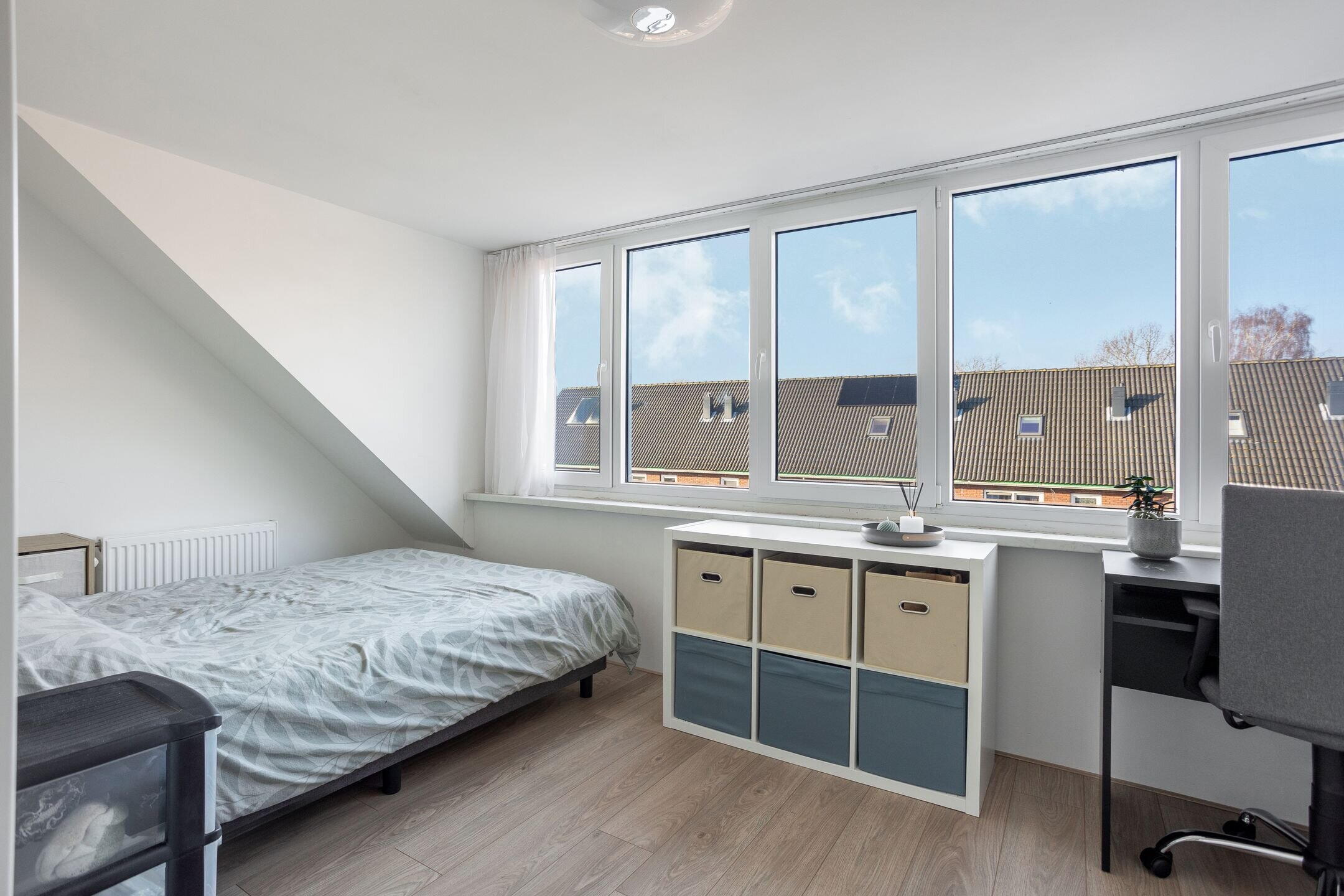 De vaste trap leidt naar de tweede verdieping met een ruime voorzolder en een vierde slaapkamer. Dankzij de kamerbrede dakkapel is deze slaapkamer bijzonder ruim en licht. De ramen zijn hier voorzien van horren en rolluiken. De voorzolder beschikt over een dakraam en biedt de mogelijkheid om een 5e slaapkamer te realiseren. Tevens bevinden zich hier de CV opstelling (2018) en de aansluitingen voor wasmachine en droger. Extra bergruimte is aanwezig achter de knieschotten. Ook deze verdieping is afgewerkt met een laminaatvloer.