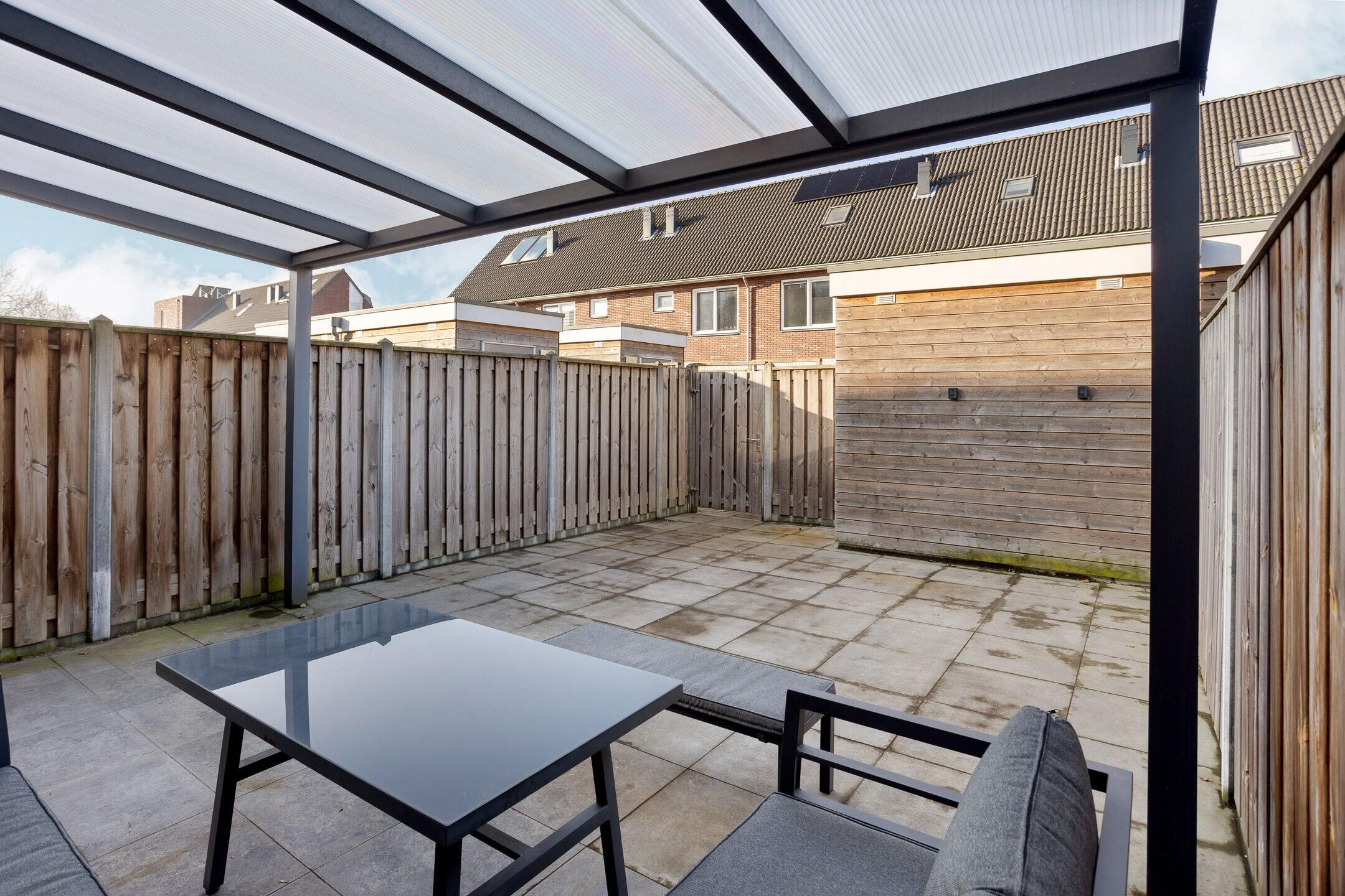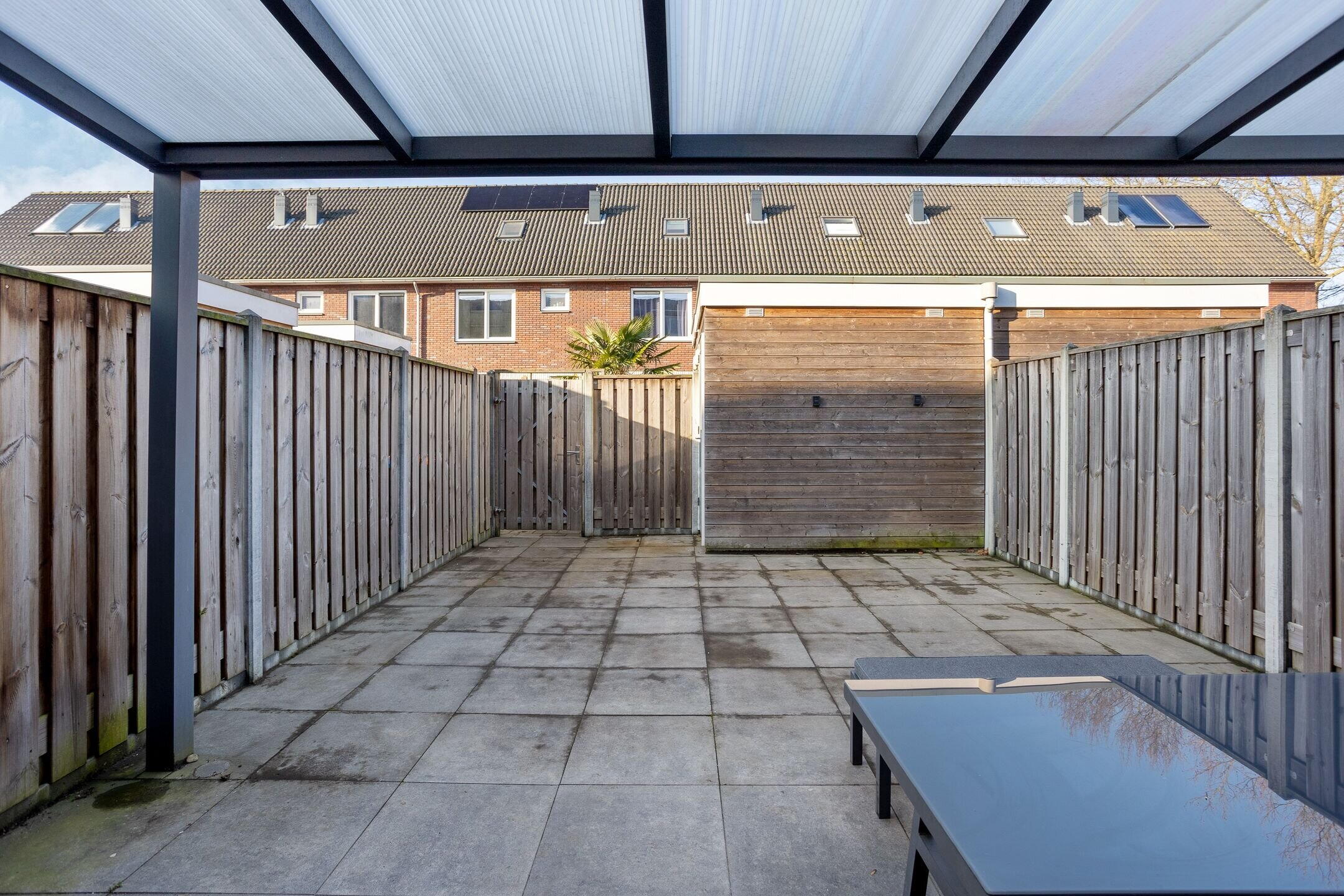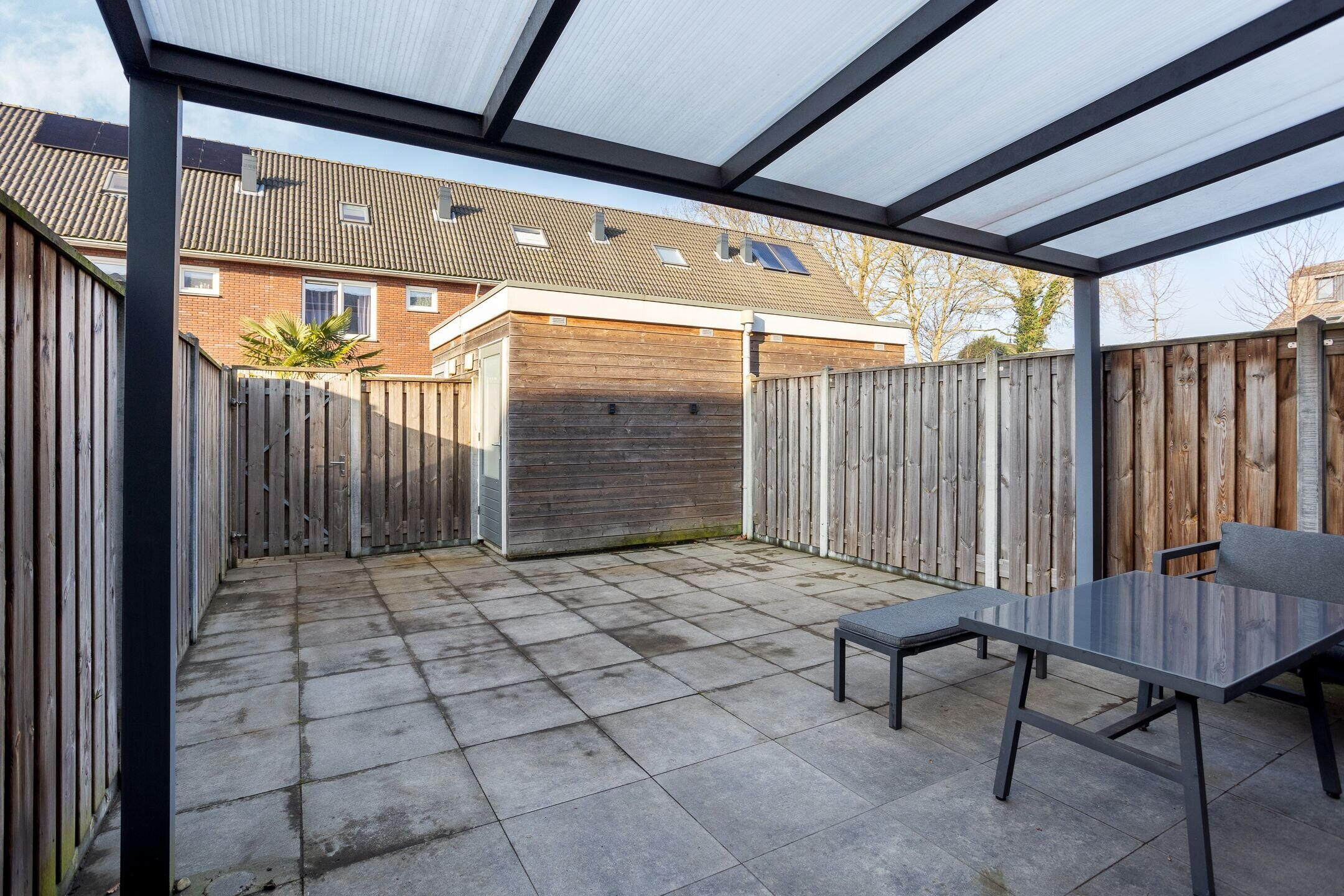 De voortuin, gelegen op het oosten, is verzorgd aangelegd. De ruime achtertuin op het westen biedt volop zonuren en een heerlijke plek om te ontspannen. Dankzij de overkapping ontstaat een fijne verbinding tussen binnen en buiten. Achterin de tuin bevindt zich een houten berging en een praktische achterom.